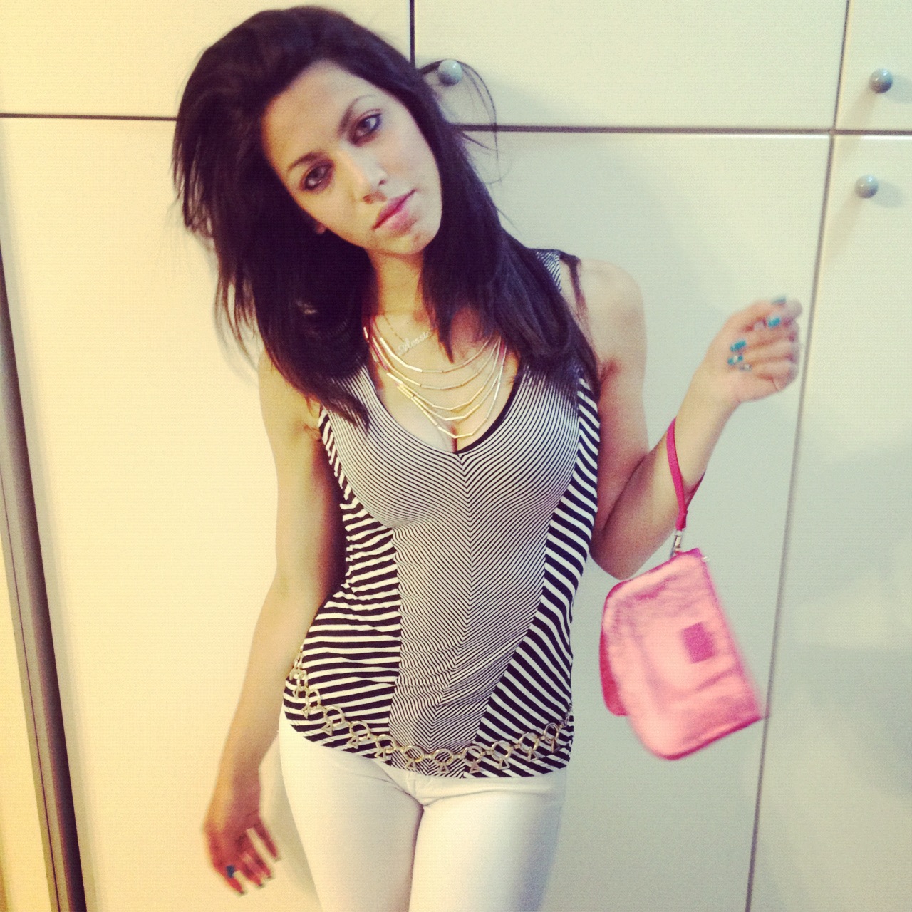 Nel look di oggi ho posto a contrasto una maglia a giro maniche Lipsy London a righe bianche e nere oblique che danno un effetto optical, una cintura dorata composta da cerchi e triangoli sovrapposti, una pochette Alviero Martini fucsia con la classica stampa geo ton sur ton con forma rettangolare.