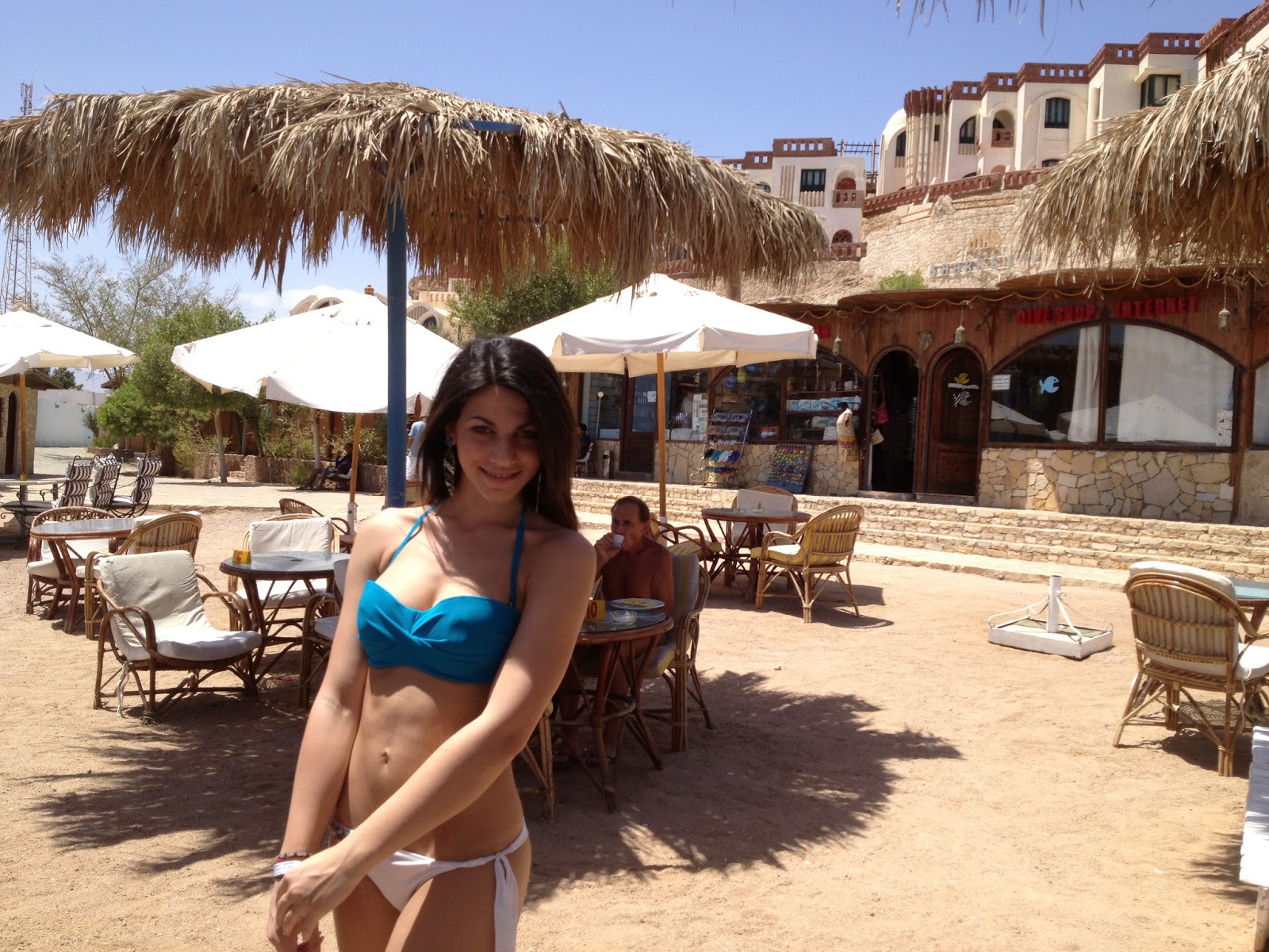 To be in fashion even in the sun, for the beachware, I mixed two pieces of different costumes: the band royal blue Victoria’s Secret and white bottom with stones in shades of turquoise Yamamay.