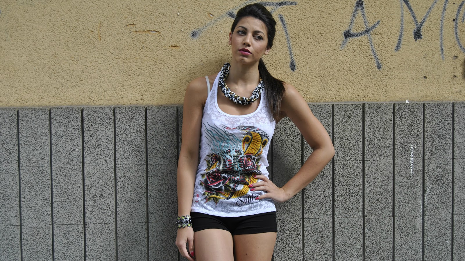The second look, biker, I created a matching top FreestyleXtreme a shorts Alessia Sica Milan, a black and white Asos necklace and a bracelet gray and lime H&M.