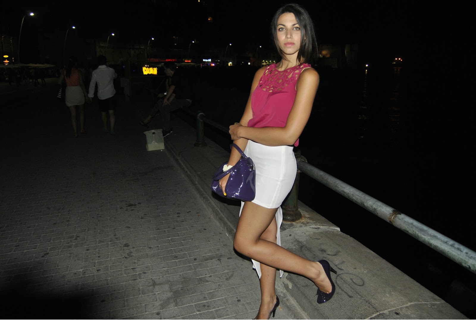 Ho festeggiato con una romantica cena a lume di candela con la mia dolce metà e per l’occasione ho indossato una blusa color fragola in seta con dettagli floreali sulla parte alta del top Vero Moda, una gonna bianca asimmetrica Alessia Sica Milano ed un completo di accessori scarpe-borsa Cinti in viola melanzana ed un bracciale con rose bianche.