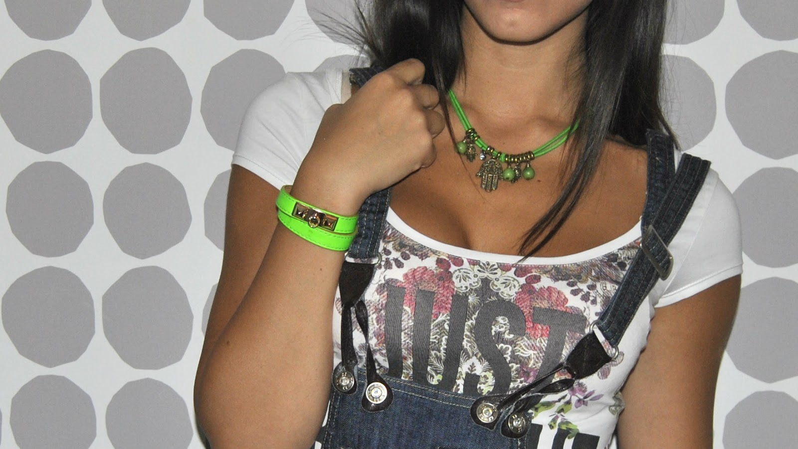 I wore a simple white tee with floral prints of the new Bershka collection combined with a denim dungarees Moschino. To complete the look neon green accessories such as necklace and a Michael Kors bracelet.