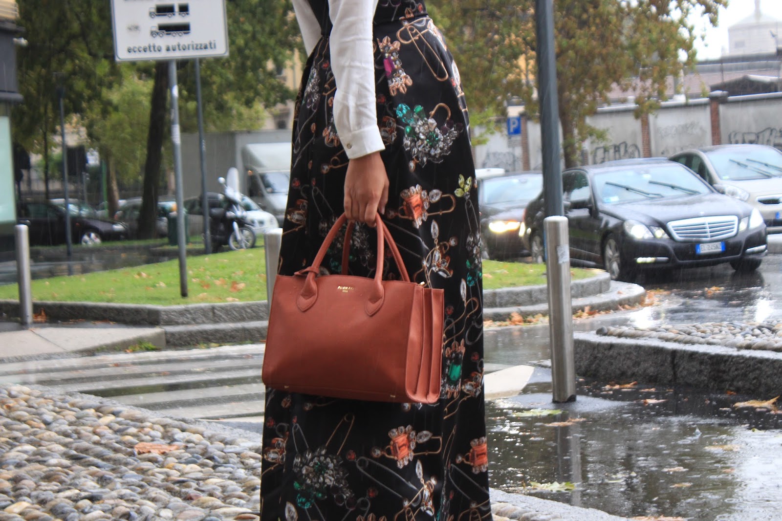 Sfilate speciali, richiedono outfit speciali. Un total look Naughty Dog composto da camicia ed abito lungo con stampa di preziosi gioielli e spille da balia, è perfetto per assistere agli show della settimana della moda (nonostante la pioggia incessante!). Comoda borsa da giorno in pelle Pomikaki in abbinamento con le nuance dell’abito.