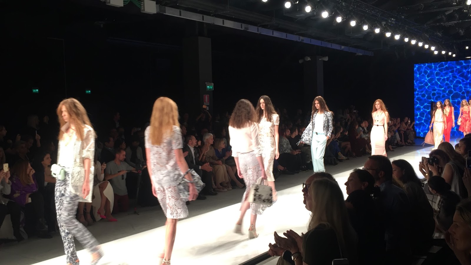 Tonalità pastello del mare quali turchese, verde acqua, indaco, carta da zucchero, cobalto, corallo, i colori che prendono forma in passerella con Aigner.