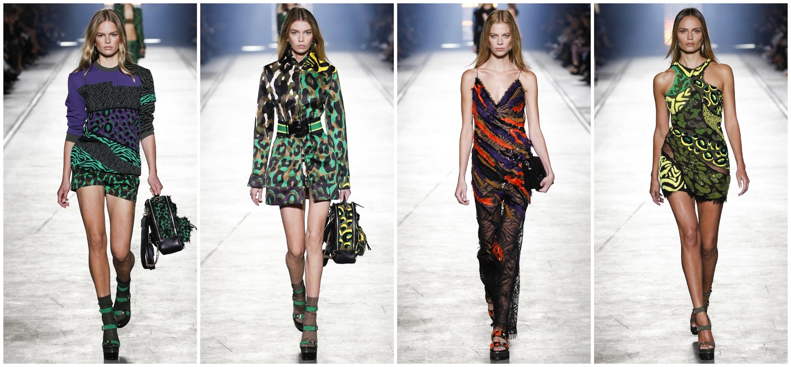 Una collezione intitolata “giungla urbana”, è quella presentata da Donatella Versace per la primavera/estate 2016, pensata per una donna determinata e sicura di sé, pronta per affrontare la frenesia quotidiana. Mini dress, abiti lunghi con seducenti spacchi, fantasie animali e camouflage, stampe e ricamati con chiffon sfrangiato effetto piuma. Non mancano i completi pantalone, le giacche corte e quelle strette in vita da cinture importanti. La figura della donna viene esaltata in modo sensuale. La borsa è quasi sempre a bauletto, abbinata agli abiti e ai sandali, alti con plateau o con la zeppa, che sembrano quasi delle sculture.