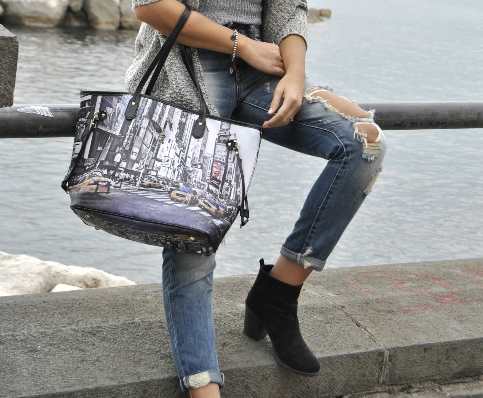 Ci sono tante cose da dire, tante cose che non vanno, tante cose belle, tante cose brutte.. Ma difronte ad un panorama così, anche quando il celo è grigio, tutti i pensieri svaniscono e resta solo l’immensità e lo splendore di un mare così… che ti fa sentire vivo, ti fa sentire libero, ti fa sentire bene. Questo è il bello di Napoli! il look che indosso oggi per fare un giro sul lungomare ed in città è un po’ underground. Il top, anni 2000 a costine in lava è firmato Forever21, abbinato ad un denim boyfriend H&M. Anche in un look così strong, non rinuncio ad un tocco glam e femminile come il mio bracciale Ops!Objects e la borsa YNot, davvero bella e comoda per una mattinata in giro!